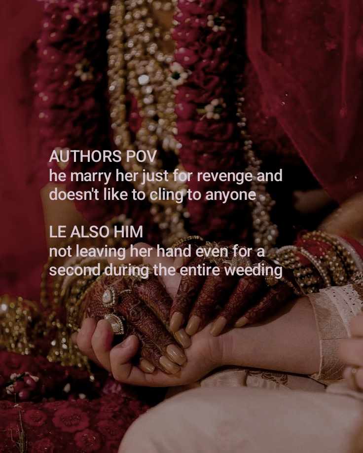 " Do as pandit ji said " I said to her she nodded she keep her trembling soft cold hand on my rough warm hand I can only feel how soft and small her hand compare to mine....wait what I am thinking I am marrying her for revenge . I was lost in thought when pandit ji calling for her parents for kanyadan ( it's an ritual done by parents or brother or parent like figure) when her mama mami start to come she shake her head as no